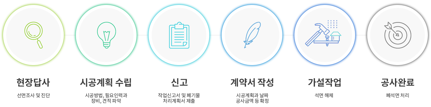 석면 해체 내부철거(상가&아파트) 석면 해체 석면 해체란? 과거에 많이 사용되었던, 1급 발암물질인 석면이 포함된 슬레이트,텍스 등을 해체 및 제거하는 과정입니다. 석면해체는 위험하고 전문적인 기술과 장비를 필요로 하기 때문에, 정식으로 석 석면해체 또는 제거업체로 등록된 업체만 시공할 수 있습니다. 석면해체 진행과정 석면해체 시공사례